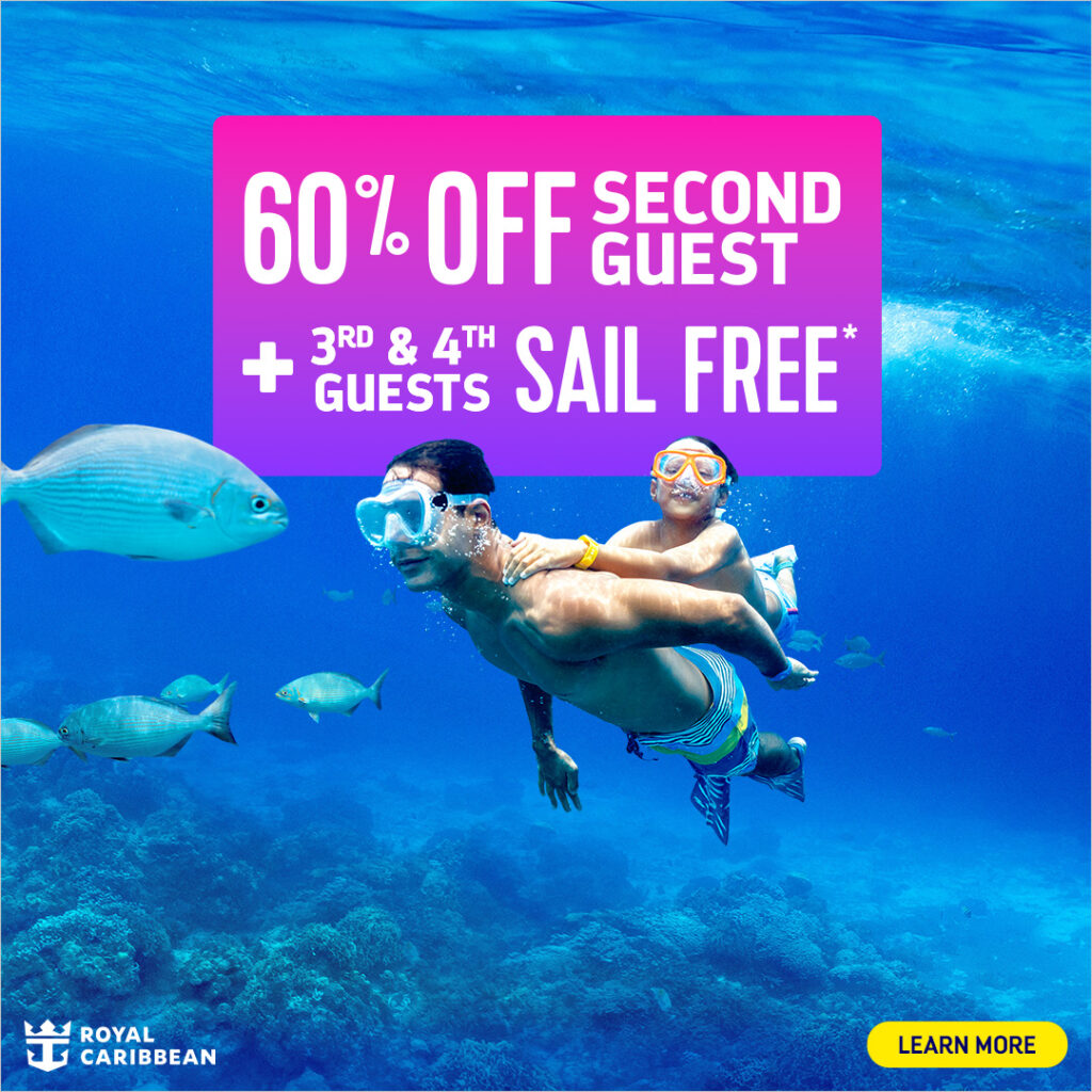 sailings please visit https://www.royalcaribbean.com/terms-and-conditions/promotions. Free 3rd & 4th Guests applies to new, individual, and named group bookings at prevailing rates made 4/2/26 – 5/4/26, on select sailings departing between 4/3/26 –